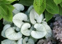 El toque definitivo en un borde con plantas perennes y pequeños arbustos lo pueden dar las Heucheras con su amplísima gama de colores llamativos y originales. Como esta Black Forest Cake de la foto superior. Este "Pastel de la Selva Negra" destaca por sus hojas muy oscuras, casi negras y unas flores en ramilletes de pequeñas campanillas de color rojo carmín que destacan sobre la vegetación. Esta Heuchera contrasta admirablemente bien con plantas de hojas claras, como por ejemplo Brunneras, de las que también podemos ofrecerte variedades magníficas, como la Brunnera Looking Glass de la siguiente fotografía, una planta excelente para zonas de sombra o semi-sombra combinada con helechos, Hostas, Heuchera, etc.