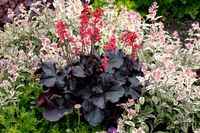 Entre ellas destacamos la Heuchera Rio por su vibrante color, o la elegante Black Taffeta para crear contrastes sorprendentes. Y también la espléndida Bloody Dinosaur, una variedad gigante que con su tamaño de 70 cm. está "a la altura" como planta de primera línea acompañando masas de grandes arbustos.
